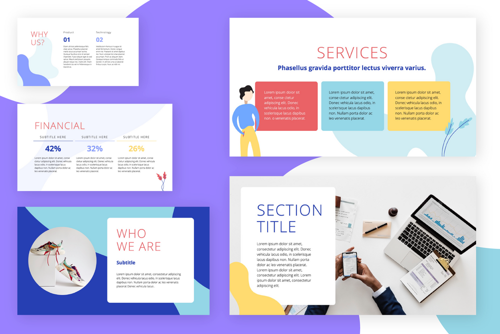 Happy Cheery PowerPoint template, with organic shapes and vivid colors. All the illustrations are ppt vectors and can be edited. A clean deck that helps to communicate your ideas, multiple slides with an editorial design, adaptable.