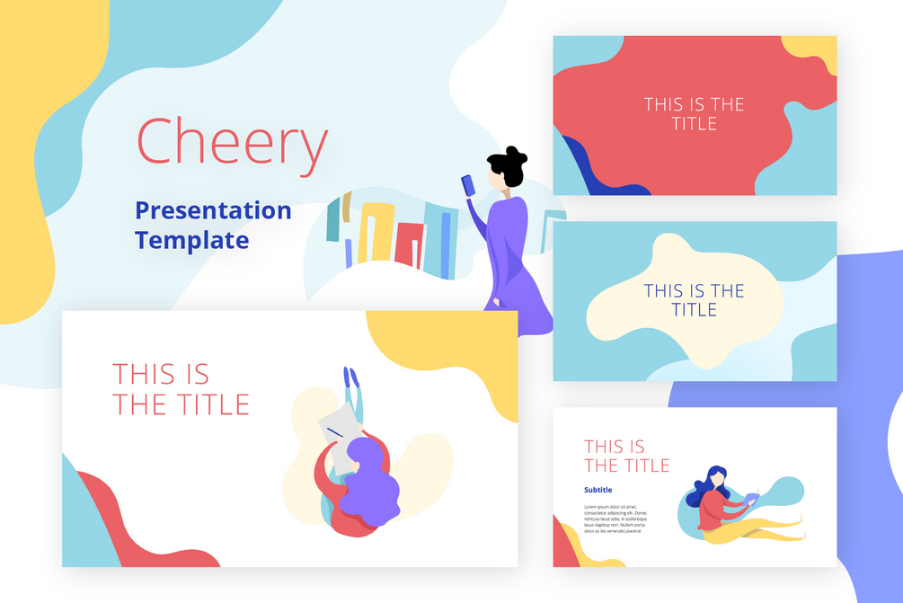 Happy Cheery PowerPoint template, with organic shapes and vivid colors. All the illustrations are ppt vectors and can be edited. A clean deck that helps to communicate your ideas, multiple slides with an editorial design, adaptable.