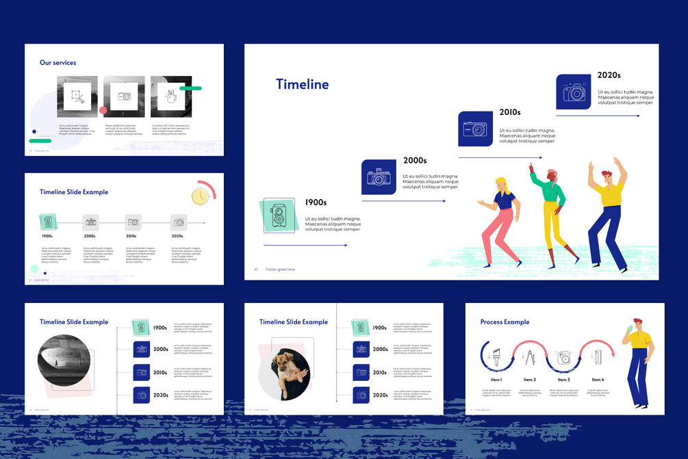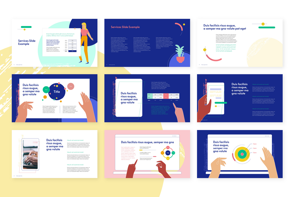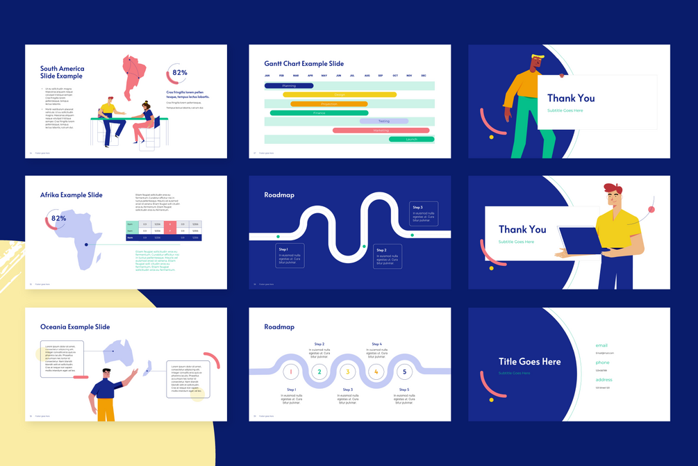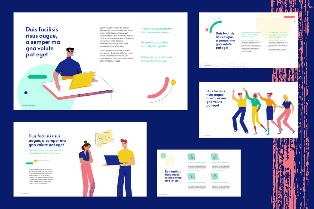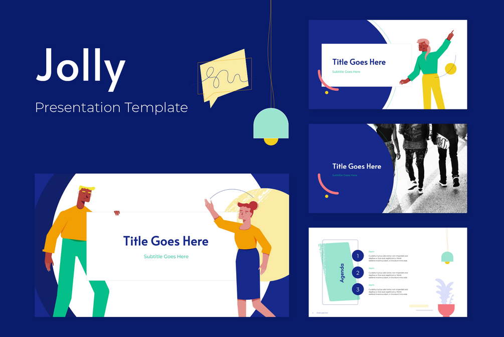 This presentation template has a modern fun happy illustration look, with colorful characters and details backgrounds and 62 different layouts.