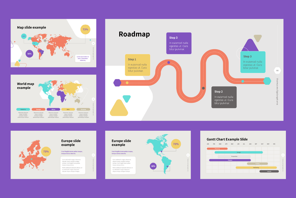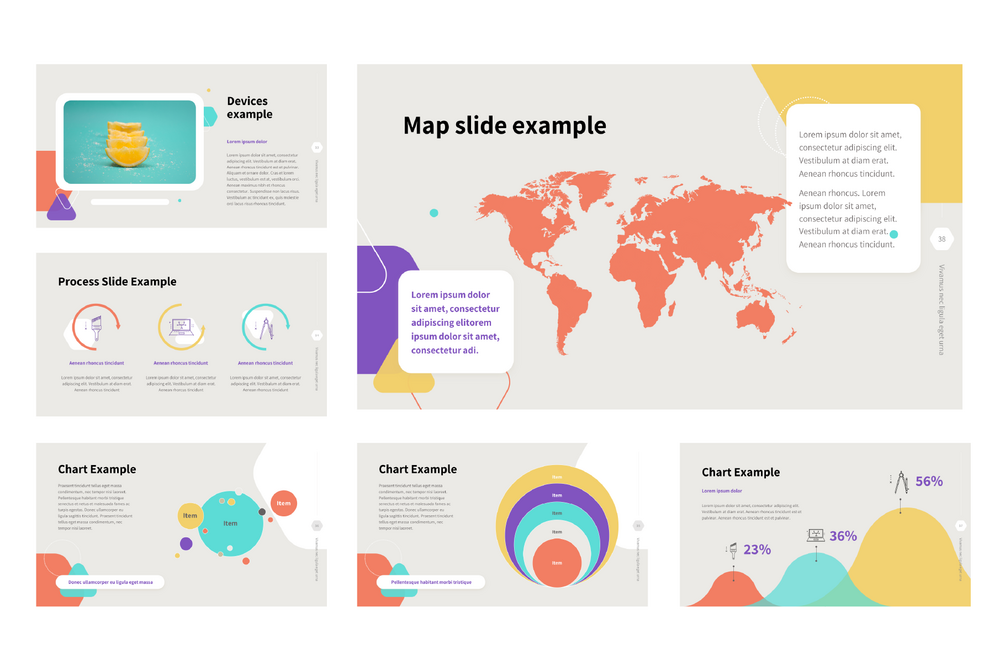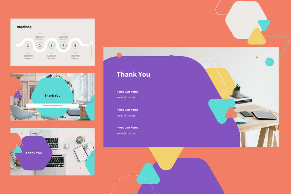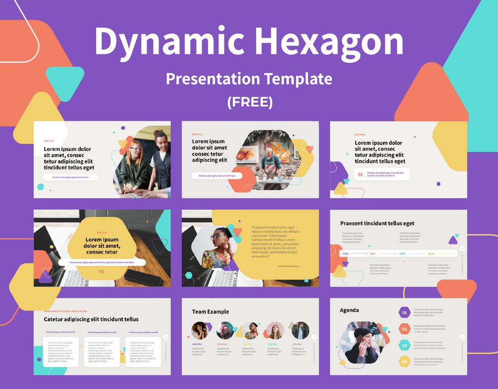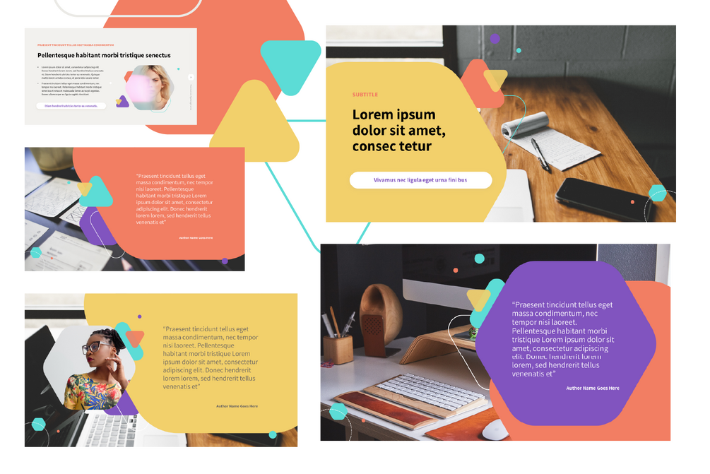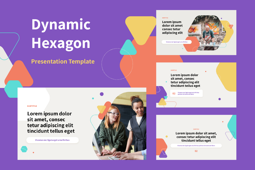 This PPT template has a modern fun style with fun colors and dynamic layouts, all created with hexagons and triangle rounded shapes. With a total of 48 slides is a perfect deck for start-up companies, unique pitch decks, or any fun presentation. It includes several layouts that will help you communicate your ideas with a strong design. It has many image place holders, layout examples, and exclusive template shapes that you can place anywhere in the slides. (I do not own the fonts. The font used for the sample is Assistant you can find it on google fonts).